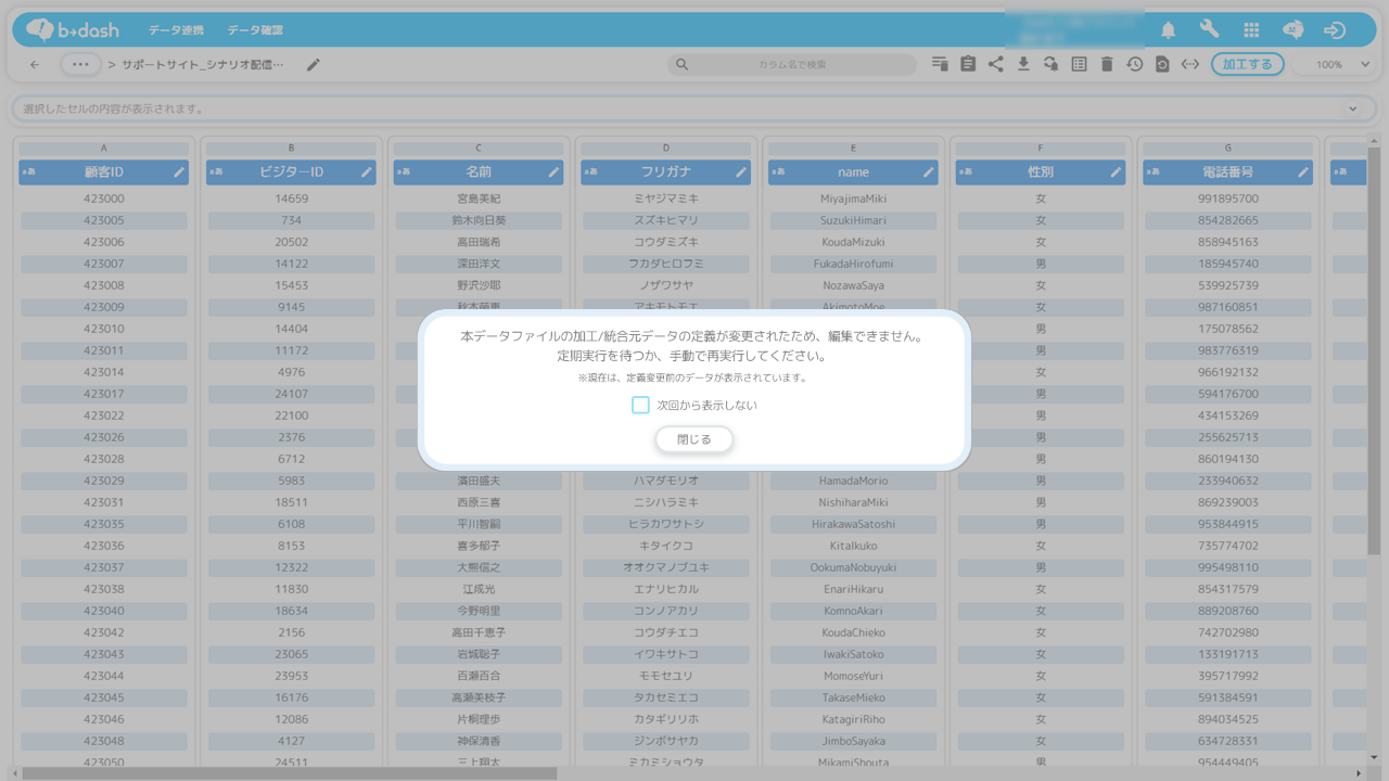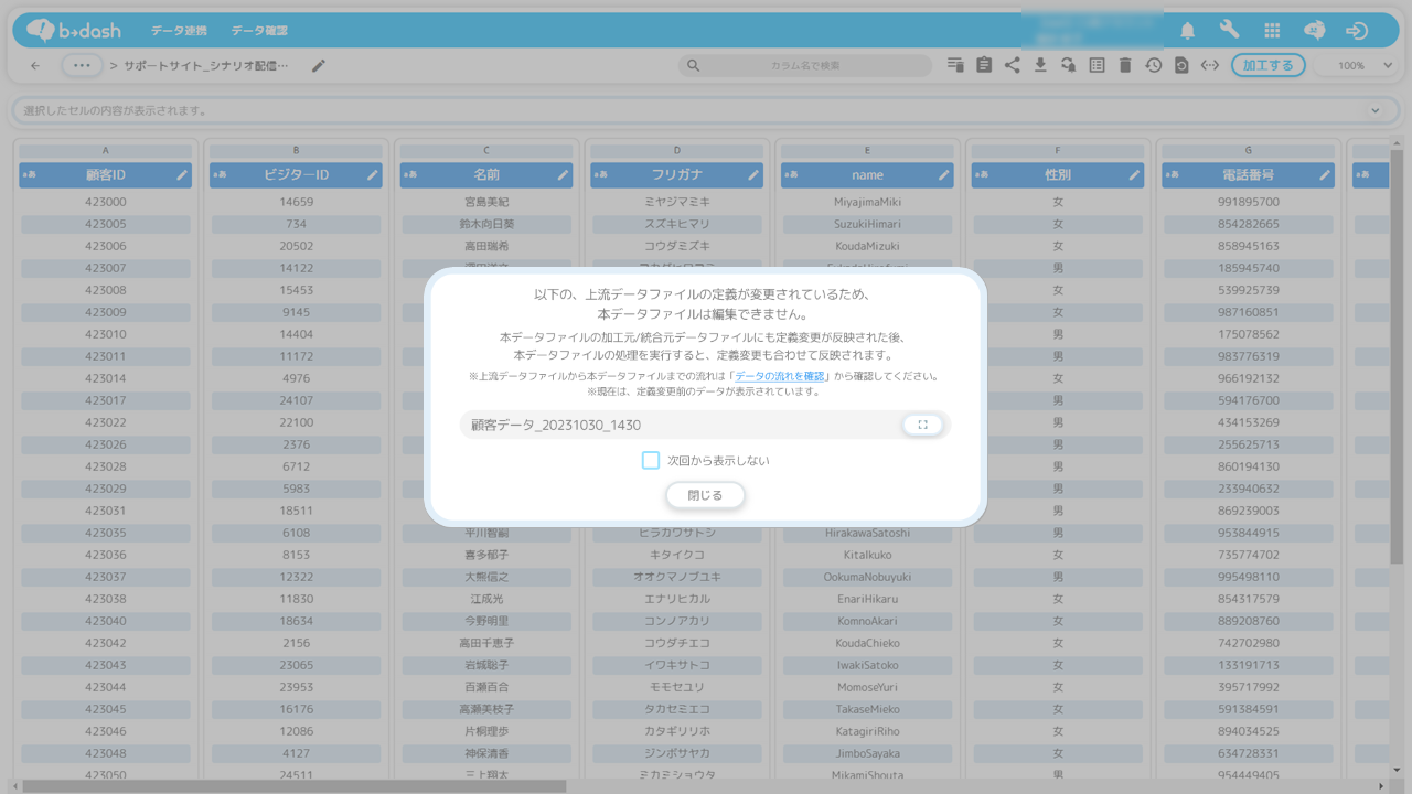 インプットデータファイルのテーブル定義が変更された場合に、後続データのデータファイル詳細画面を開くと、以下のいずれかのモーダルが表示され、後続データの操作が制御されます。