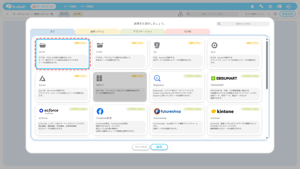b→dashで取込可能なファイル形式は、本記事の「SFTP連携において、b→dashに取り込めるデータファイル形式とパスワードの入力有無」に記載のもののみになります。