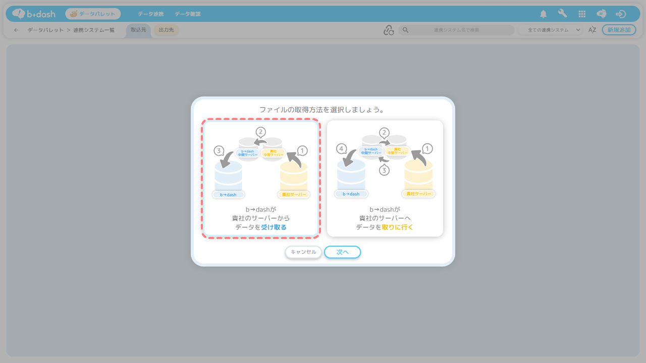 「b→dashが貴社のサーバーからデータを取りに行く」を選択し、「次へ」をクリックします