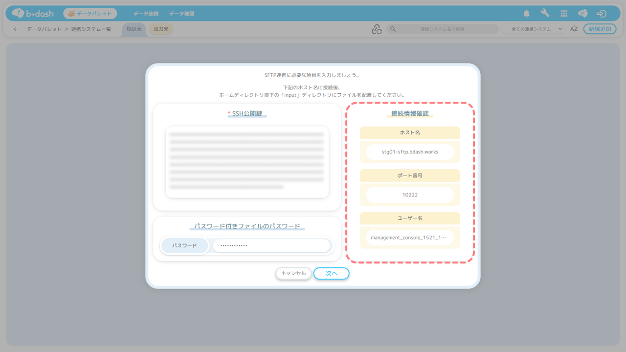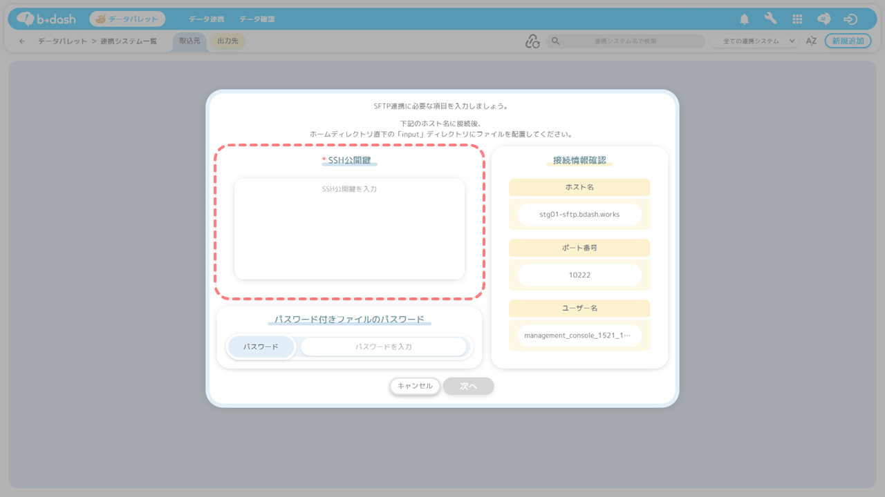 b→dashが貴社のサーバーへデータを取りに行くパターンでは、接続情報として「ホスト名」や「ポート番号」などの4項目を事前に準備する必要がありますが、貴社のサーバーで「SSH公開鍵/秘密鍵」を発行し、準備する必要はありません。