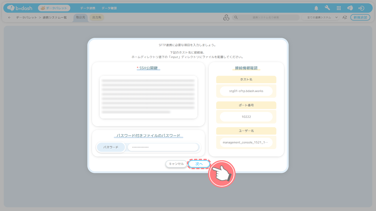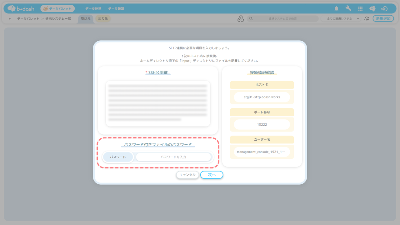 SFTP連携において、b→dashに取り込めるデータファイル形式とパスワードの入力有無