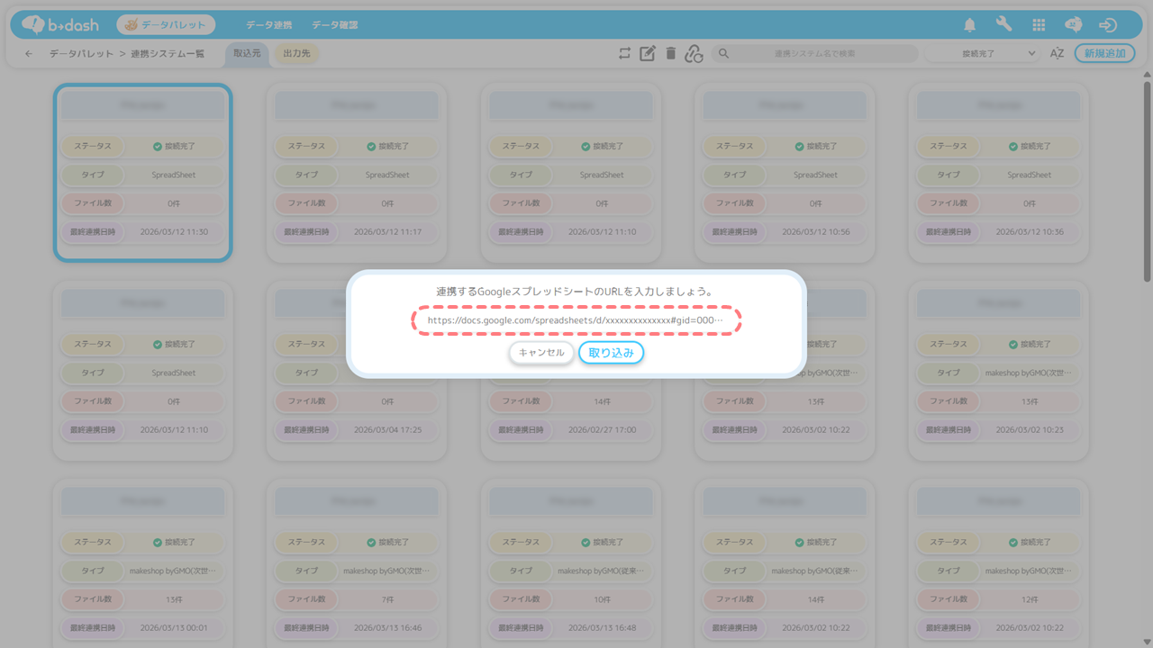 「連携するGoogleスプレッドシートのURL」を入力し、「取り込み」をクリックします