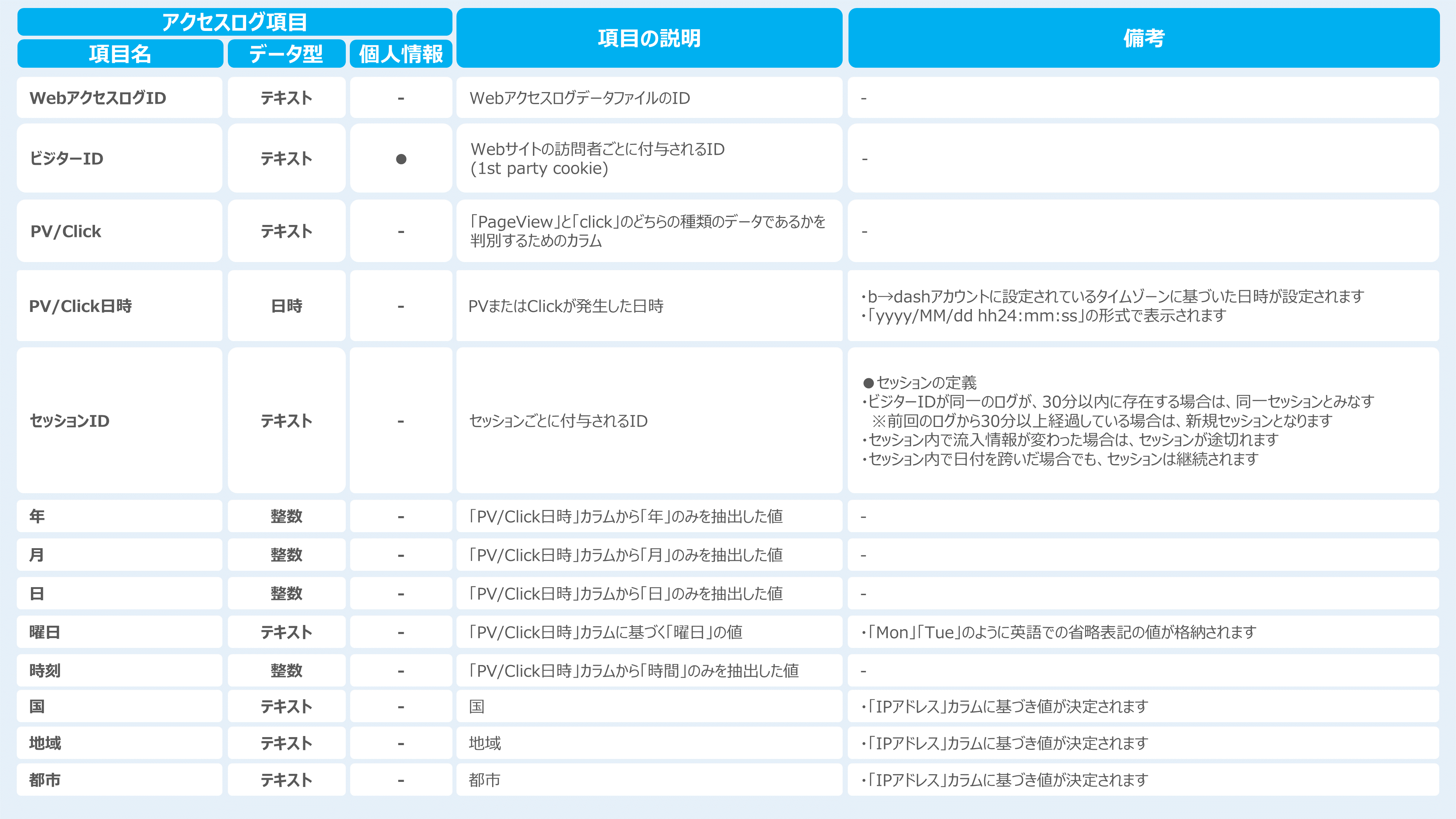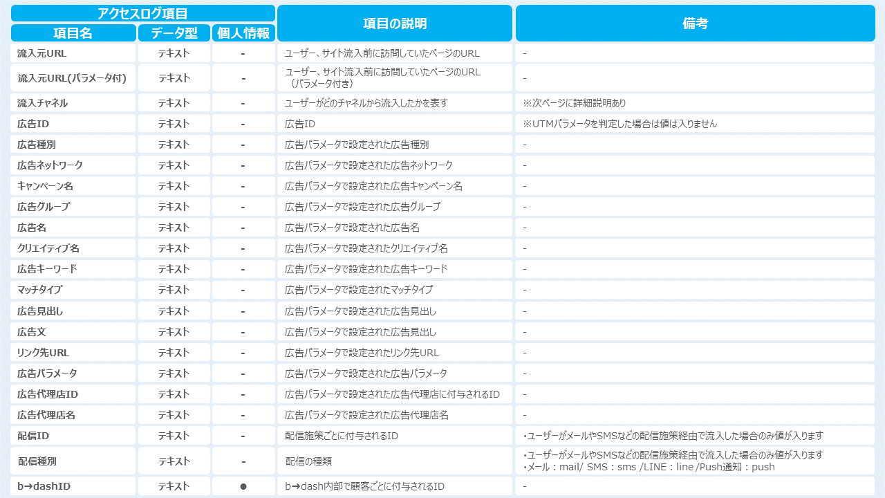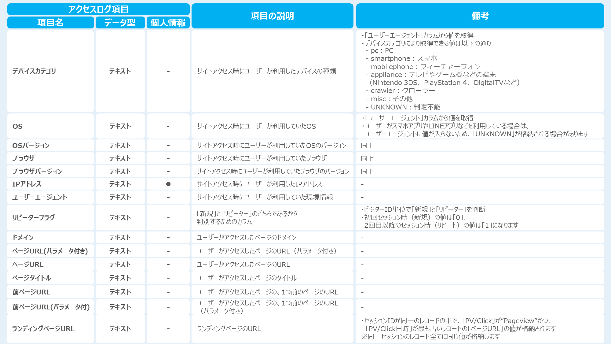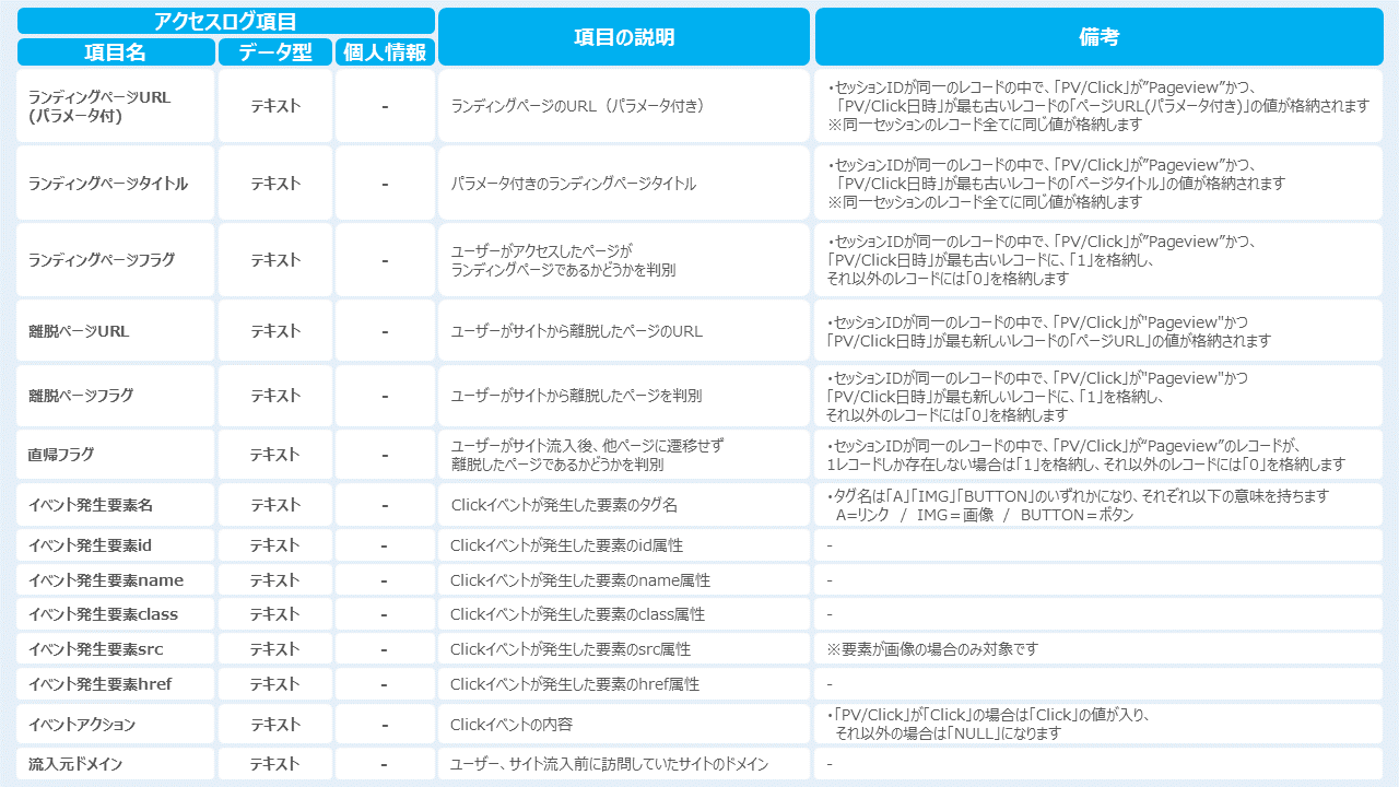 アクセスログタグを設置することで取得できるデータ(カラムの種類)は下記になります。